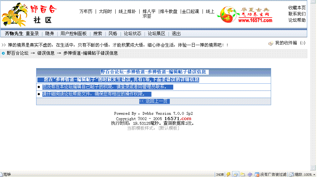 好了,我登录上来了。ID被封,是悄悄进行的,在论坛里没有公开说明;ID解封,也是悄悄进行的,在论坛里也没有公开说明。被封的具体时间我非常清楚,因为一下子突然就无法浏览网站了;而什么时候被解封呢?我用“双目怪人”发帖子之后,有人表现得茫然不知的样子说:好像没被封吧?(http://www.16571.com/bbs/dispbbs.asp?BoardID=4&ID=39483&replyID=330464&skin=1)这时候我才发现“齐物先生”的ID上“不受欢迎”的字样变了。别以为我不知道野百合的习惯,这么一个重大事件,在版主会议厅里没有讨论?就算ID被封,我照样可以在首页上看到某些管理人员浏览版主会议厅里讨论我这些发言的帖子。