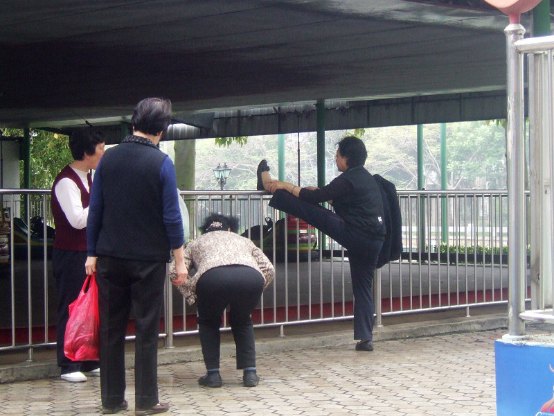厦门中山公园是老人家的乐园.我们住的酒店就在中山公园的的旁边,一早我们就进公园去散步,看到整个公园几乎全是中老年人,以老年人居多,男男女女,有喝茶的,有打太极的,跳太极舞的,有跳交谊舞的,有下棋的,有聊天的,五花八门,应有尽有.下图为一位压腿的老人,她压得特别好,我们几个人都说无法压到她的水平,有几个估计是她的朋友,买了菜回来,见她在压腿就与她聊天,一位还蹲下来看.特逗.